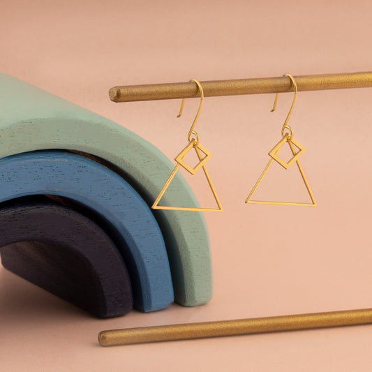 14K Solid Gold Double Triangle Dangle Earrings - Gold Jewellery - Dainty Geometric Earrings - Double Open Triangle Earring - Earrings Dangle